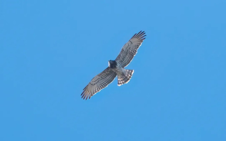 照片里的“神秘来客”很快揭开了面纱。6枚分明的翼指、褐色的头部与胸部、翼下及腹部散布的褐色点状斑,再加上短而带横纹的尾羽……经过仔细比对,队员们兴奋地确认,这正是国家二级重点保护野生动物短趾雕。“结合翱翔方向与利用气流的行为,我们推测它正处于由北向南的迁徙途中。”一名队员介绍道。